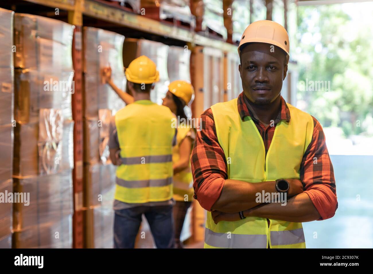 Portrait African Black Warehouse Supervisor Standing And Crossed His Arms In Large Warehouse Distribution Center With Worker Work On Inventory In Back Stock Photo Alamy